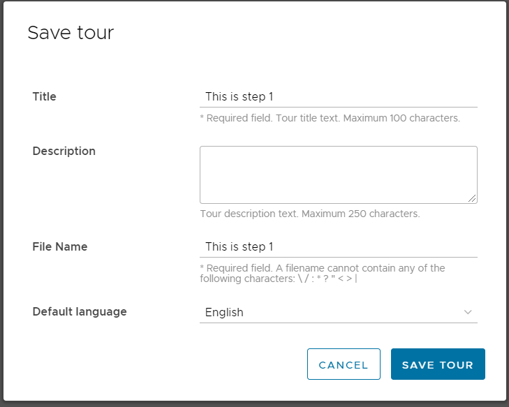 Once you have completed all the steps you can Preview the Tour in the bottom left. This will take you through the Tour you have just created. Once you are happy with it all, click Save Tour. This provides a popup to add some additional tour details like a Title, Description, File Name and the default language to present the Tour in. This step will save the Tour to your local machine.