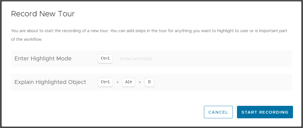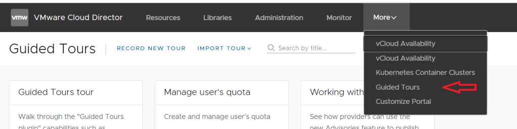 One of the cool new features of the latest release of VCD is guided tours. This allows you to make tours available to your tenants to help them navigate more complex tasks. On top of that, you can actually create the tours directly in VCD by recording the steps and then go back and edit things to make sure it is perfect. This feature is going to make it much easier for you to onboard tenants and make things a lot more self service from a learning perspective. I will preface this with a qualifier that this is the very first drop of Guided Tours so it is fairly limited in functionality but does lay the groundwork for what will become an indispensable part of VCD. With that said, let’s dive in!