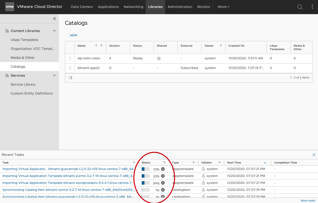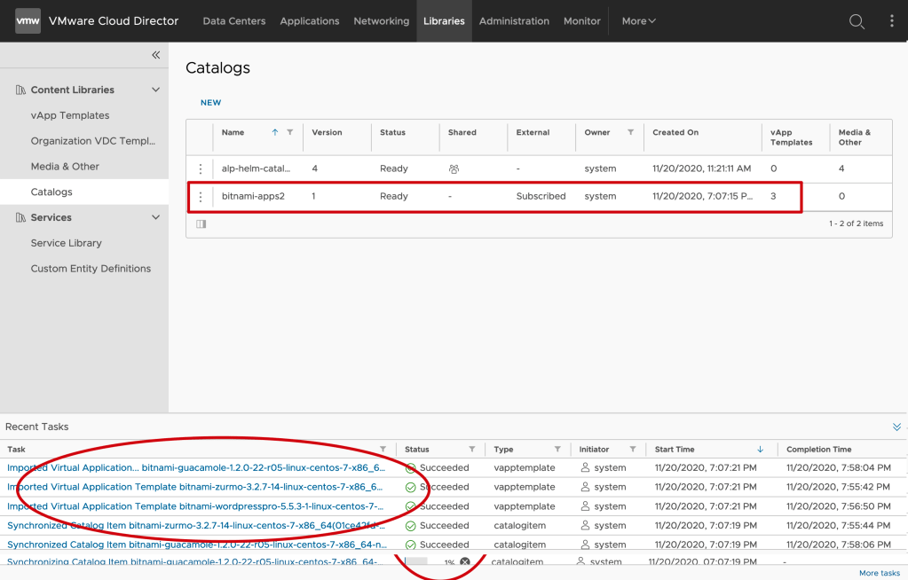Step 9. Once the subscription succeeds, the application import starts. You can check progress from vCD task panel.