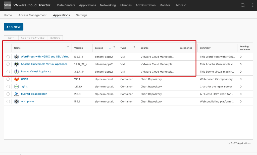 Step 11. Open App Launchpad portal, navigate to Applications tab, you can see those Bitnami applications. Then you can publish this catalog to your tenants and create workloads there.