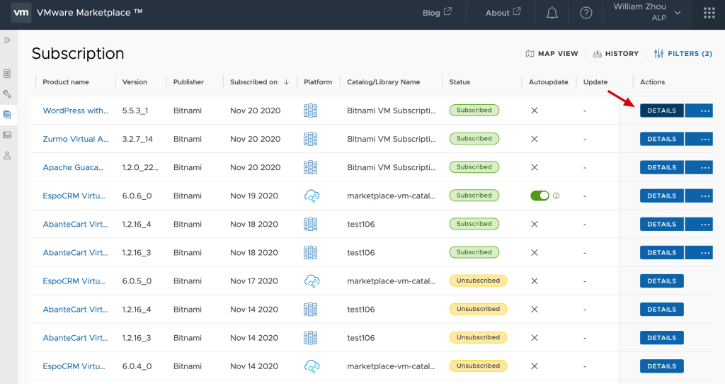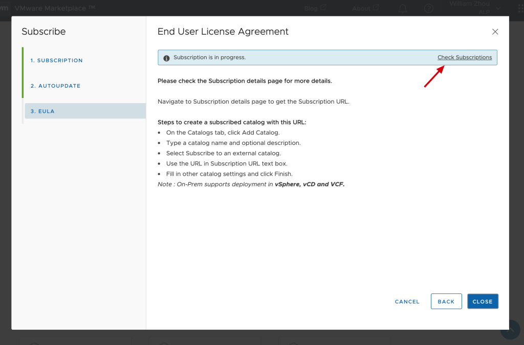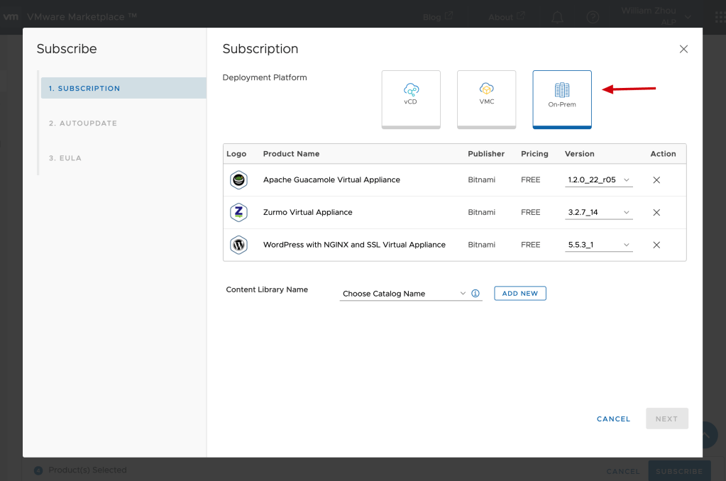 Step 2. Multi select several applications that are applicable for both On-Prem and Cloud Director. Click Subscribe to open the subscribing page. Click On-Prem and proceed to create the subscription.